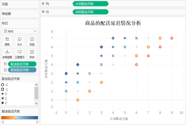 将“配送延迟天数”拖放到“颜色”和“形状”标记上,并为视图添加标题等,从视图可以看出商品的配送延迟天数分布情况。