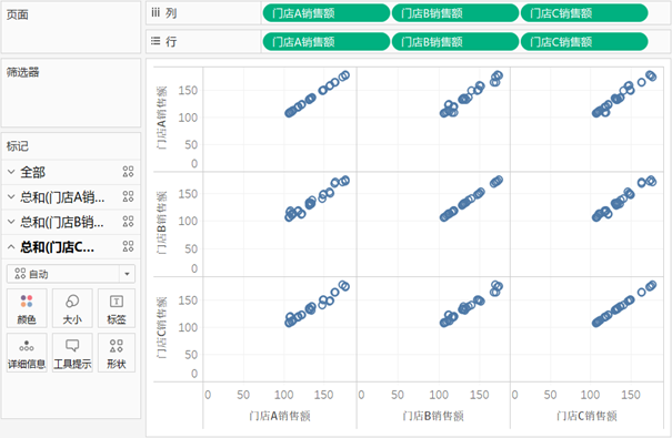 将“门店A销售额”拖放到列功能区,将“门店B销售额”拖放到行功能区。通过菜单栏“分析”下的“聚合度量”对变量进行解聚。然后设置横轴和纵轴的刻度范围,都从100开始。