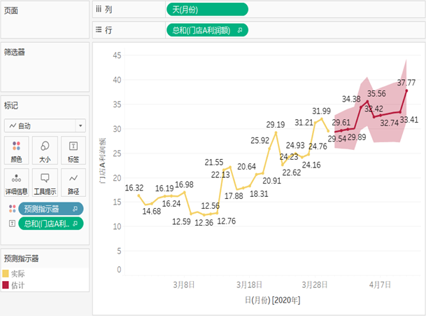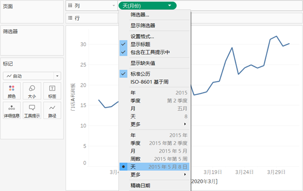 - 将“门店A利润额”拖放到行功能区,将“月份”字段拖放到列功能区,并单击右键,在弹出的下拉框中选择“天”,切换日期字段的级别,视图区即显示3月份门店A利润额的时间序列图。