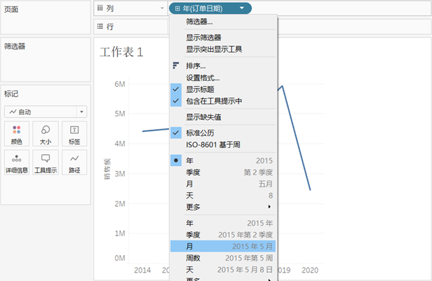 为了观察订单按月份的趋势,可以单击列功能区中的“年(订单日期)”,然后选择“月 2015年5月”选项。