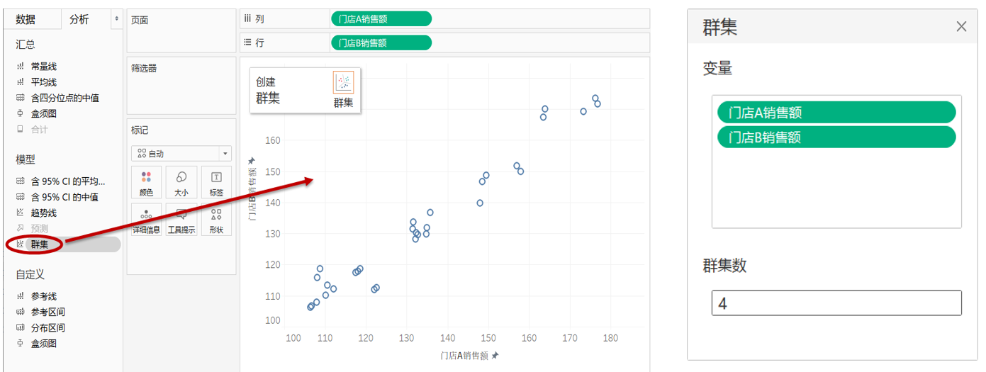 拖放“分析”窗口中的“群集”到右侧视图中,在视图的左上方会显示创建群集的信息。