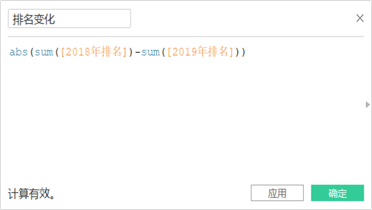 注意:由于“2018年排名”和“2019年排名”都为非聚合字段,因此在公式中需要对字段进行聚合处理,如添加SUM函数,才能让两个字段进行计算。