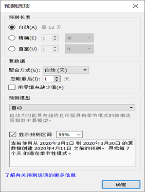 - 在“预测选项”窗口中,将“预测长度”选项设置为“自动”,“聚合方式”选项设置为“自动”,“预测模型”选项设置为“自动”,然后单击“确定”按钮。