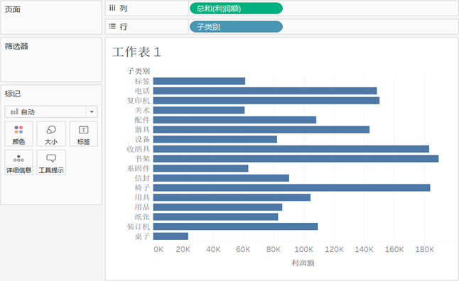 - 连接“商品订单表.xlsx”数据源后,将度量下的“利润额”字段拖放到列功能区,维度下的“子类别”字段拖放到行功能区,Tableau会自动生成条形图,显示商品在各个子类别上的利润额。
