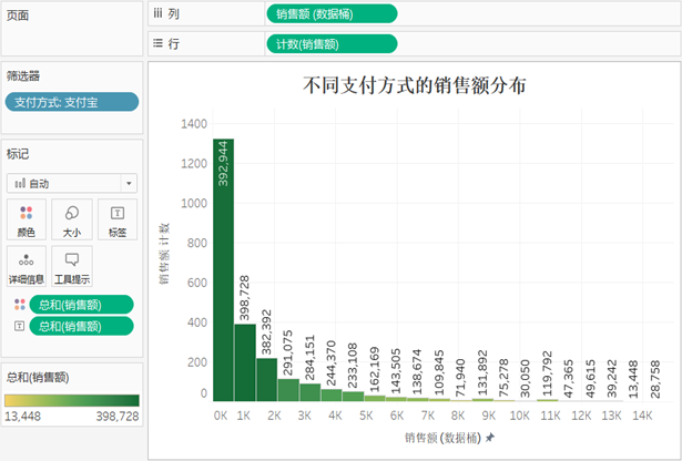 将“销售额”字段拖入“颜色”和“标签”标记,并为视图添加标题等,现在可以看出使用支付宝这种支付方式的订单销售额分布情况。