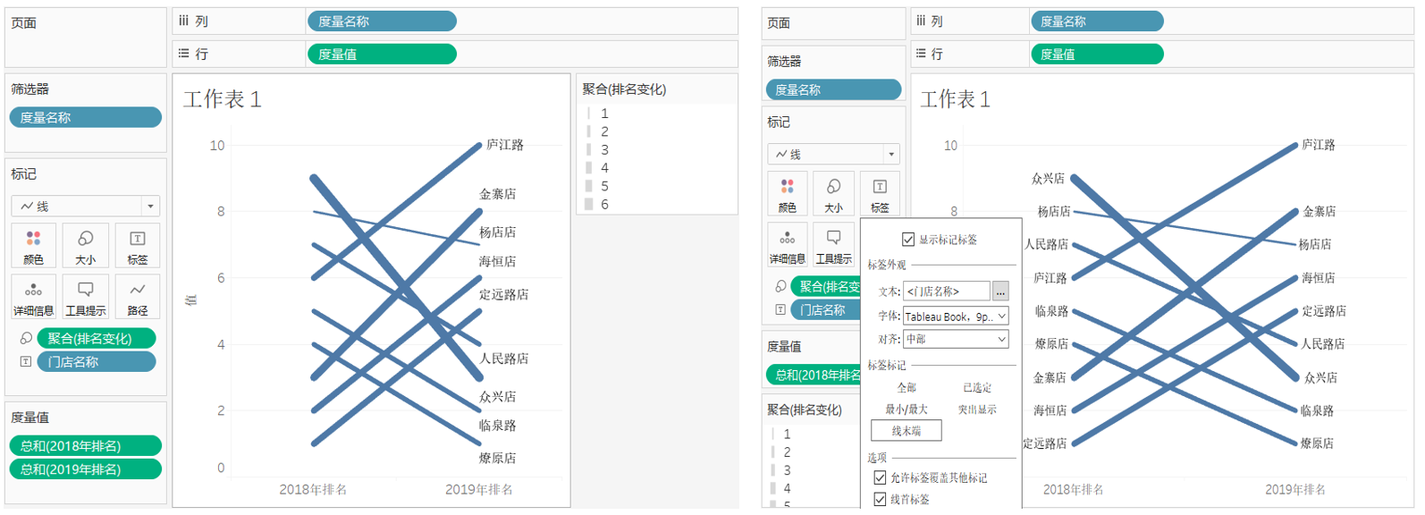 将“排名变化”字段拖放到“大小”标记,将“门店名称”拖放到“标签”标记。
