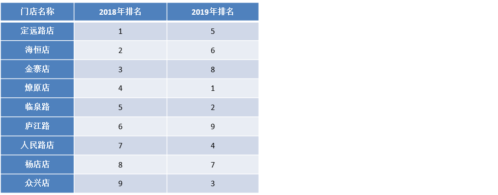 数据包含门店名称、2018年排名、2019年排名三个字段。