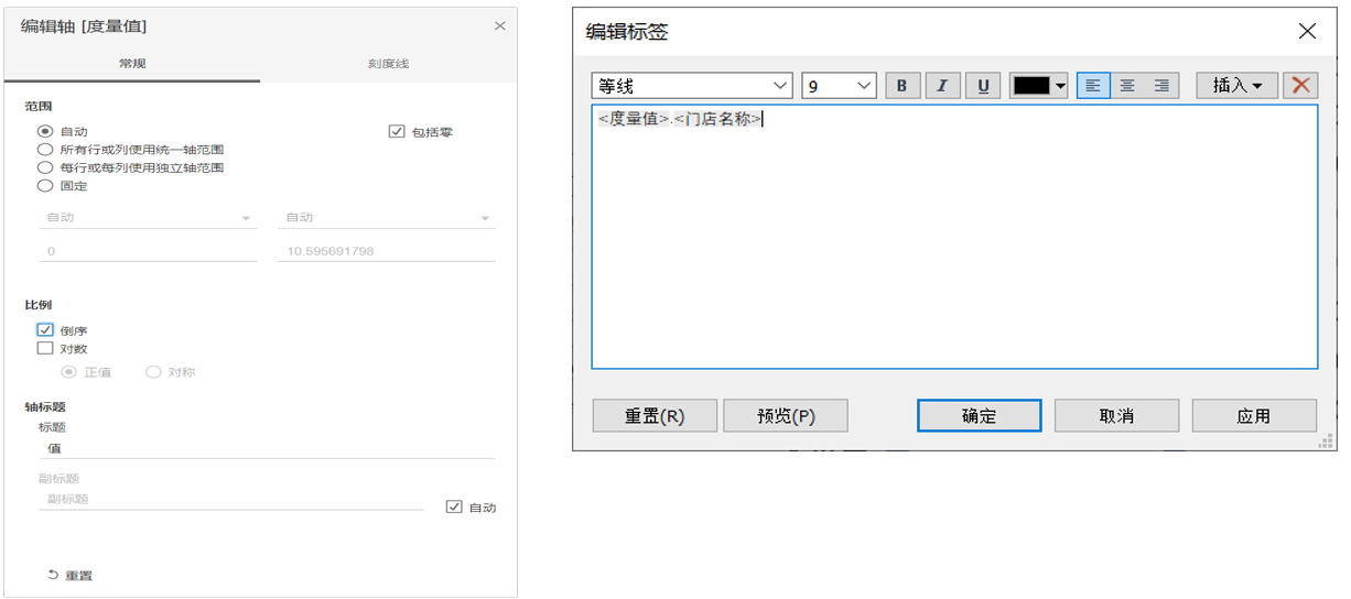 将“度量值”拖放到“标签”标记,单击“标签”进入其设置页面,将标签设置为“<度量值>.<门店名称>”,在视图中将按照设置好的格式进行显示。