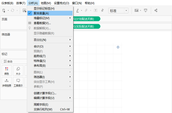 将“门店A销售额”与“门店A利润额”分别拖至列功能区和行功能区,此时视图区域仅有一个点,这是由于Tableau会把两个度量按照“总和”进行聚合。选择菜单栏“分析”下的“聚合度量”选项,移除选中标记,即解聚这两个度量字段。