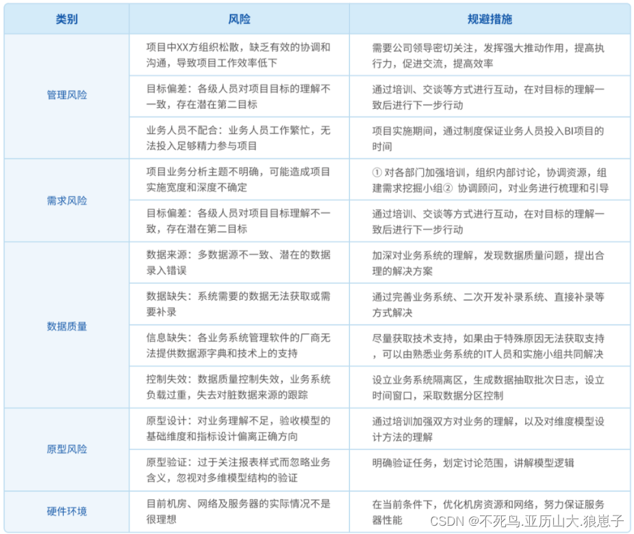 任何项目都存在一定的风险,因此需要对风险进行预测和管控,以求最大限度避开风险、减少损失,让项目成功落地。在BI项目的实施过程中,需要进行风险管控的有管理、需求、数据质量、原型、硬件环境这几个方面,具体可能存在的风险和规避方式可以看下面这张表格。
