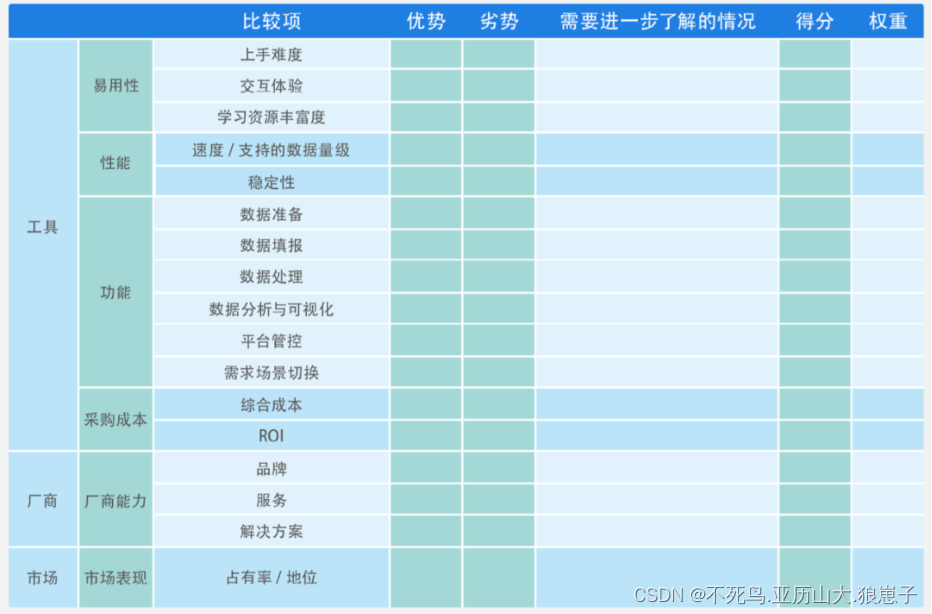 最后还给大家分享了一张BI工具选型的评分表,企业可以根据评估维度打分后再按照权重计算总分来评估各个BI工具。