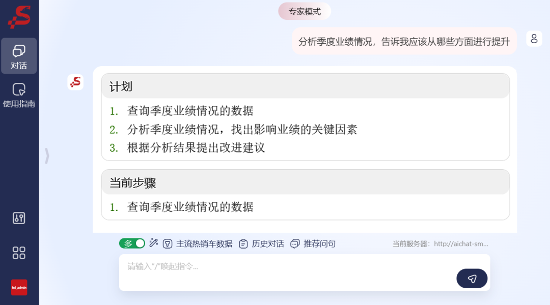 比如说,当你有分析想法但是不知道怎么提问的时候,你可以直接就想法向Smartbi AIChat提问,它可以根据想法拆解任务模式,列出思考的计划和步骤,并逐一完成分析,最后再提供数据洞察报告,让决策更智能更高效。