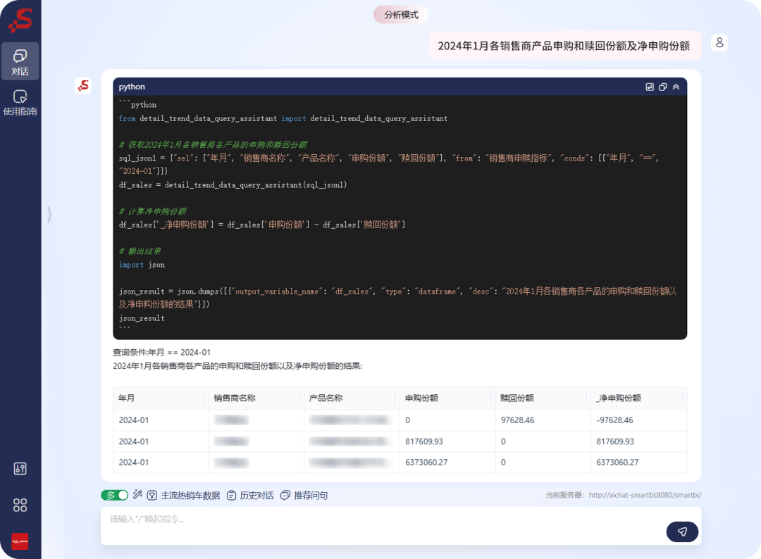 投顾业务管理:管理者可通过对话式查询关键指标,如“2024年1月各销售商产品申购和赎回份额及净申购份额”,系统自动解读数据,精准洞察市场动态,提高交易量。