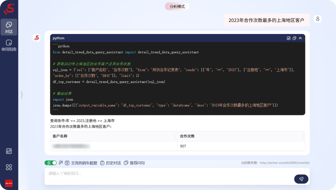 智能客户画像:业务人员用自然语言查询“2023年合作次数最多的上海地区客户”,系统自动解析并生成数据报告,提升精细化运营能力。