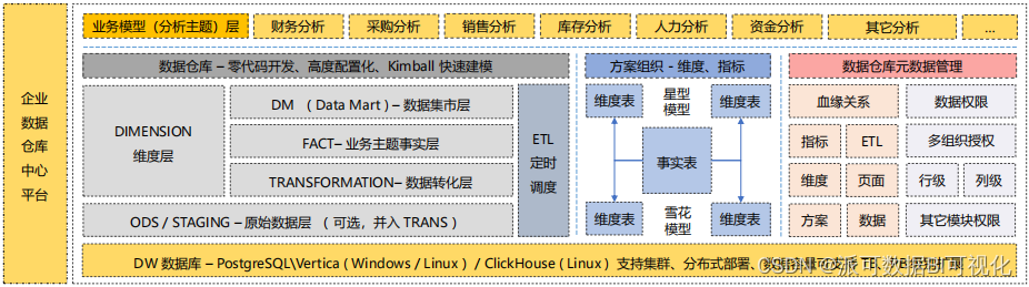 准确的来说,商业智能BI不仅仅包含前端可视化分析、报表展现的能力,更包含了底层数据仓库的建设过程。Gartner 在上世纪九十年代就已经提到了商业智能 Business Intelligence,它更多的认为:BI是一种数据类的技术解决方案,将许多来自不同企业业务系统的数据提取有分析价值的数据进行清洗、转换和加载,就是抽取Extraction、转换 Transformation、加载Loading 的ETL过程,最终合并到一个数据仓库中,按照一定的建模方式例如Inmon 的3NF 建模、Kimball 的维度建模或者两者都有的混合式架构模型,最终在这个基础上再利用合适的分析展现工具来形成各种可视化的分析报表为企业的管理决策层提供数据决策支撑。