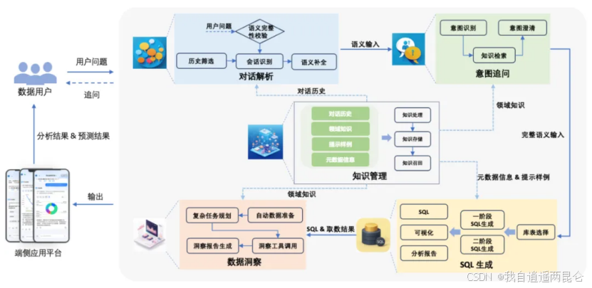 知识管理模块,对话解析模块,意图追问模块,SQL生成模块,数据洞察模块